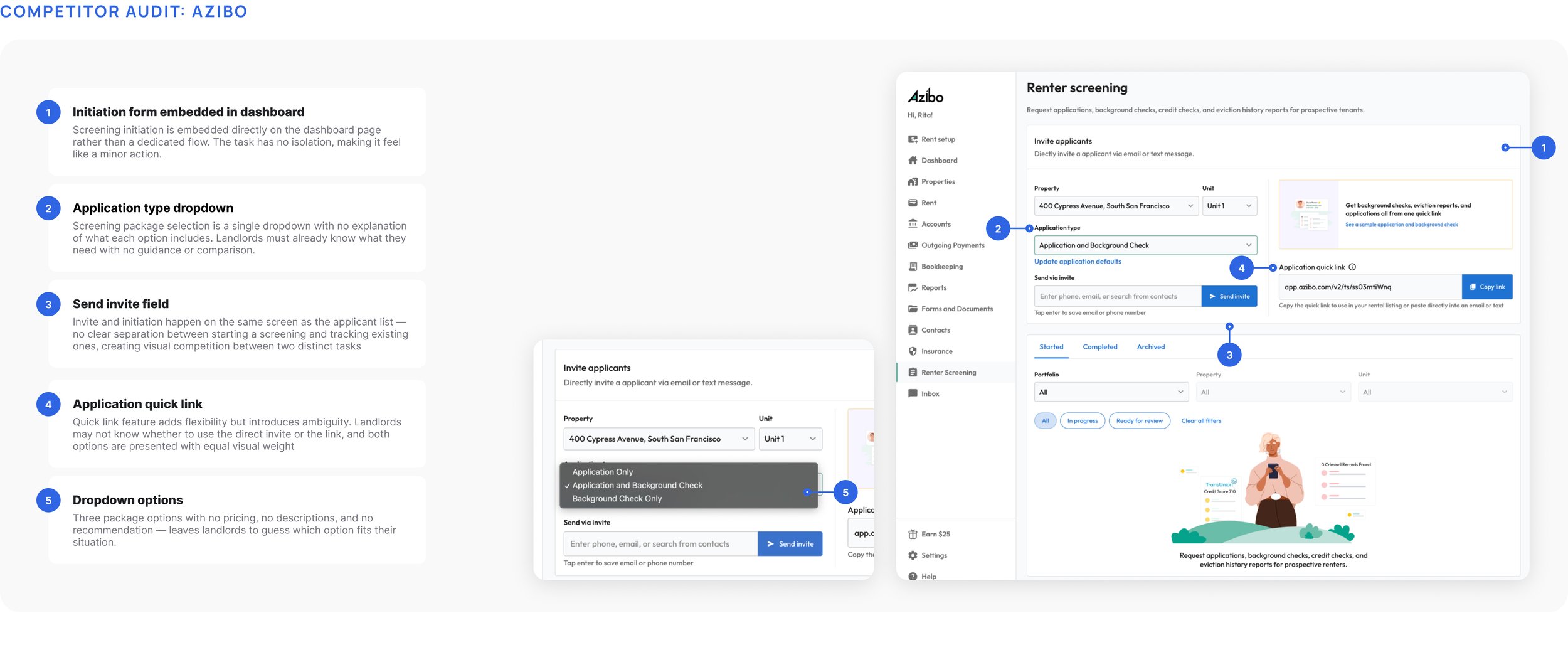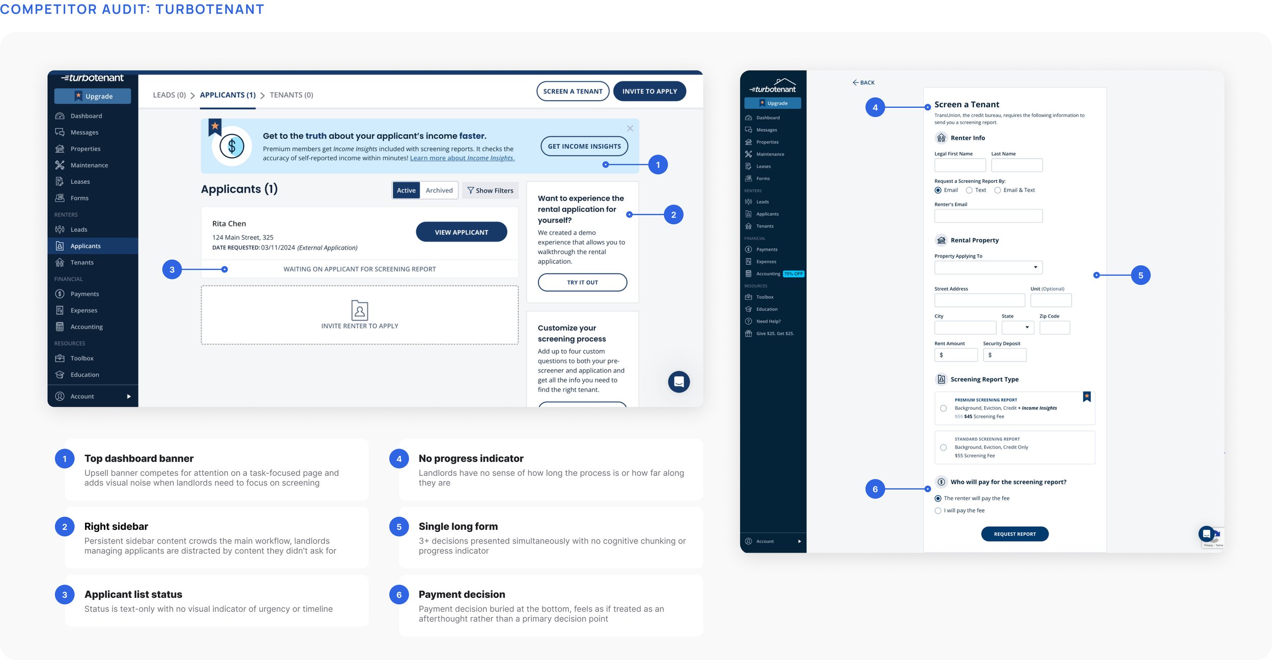 I audited the screening flows of TurboTenant, Azibo, and RentPrep's original design to identify failure modes and establish a clear design direction grounded in what competitors were getting wrong.