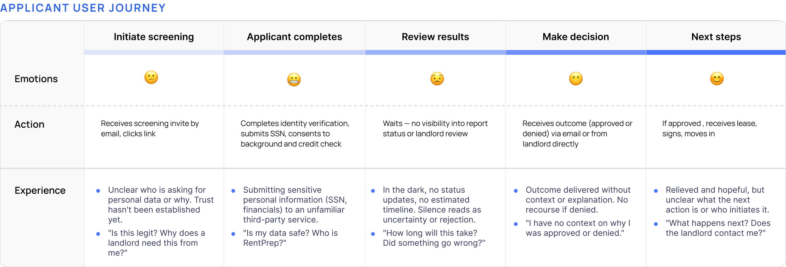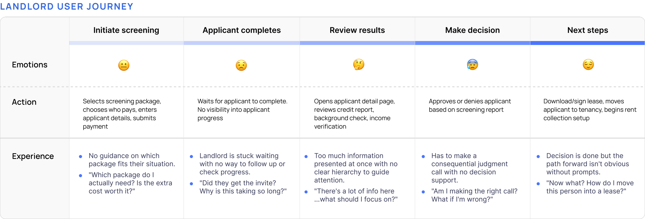 Because this was a two-sided flow, I mapped both the landlord and applicant journeys before touching a single screen — capturing actions, thoughts, and emotional state to identify where friction was highest.